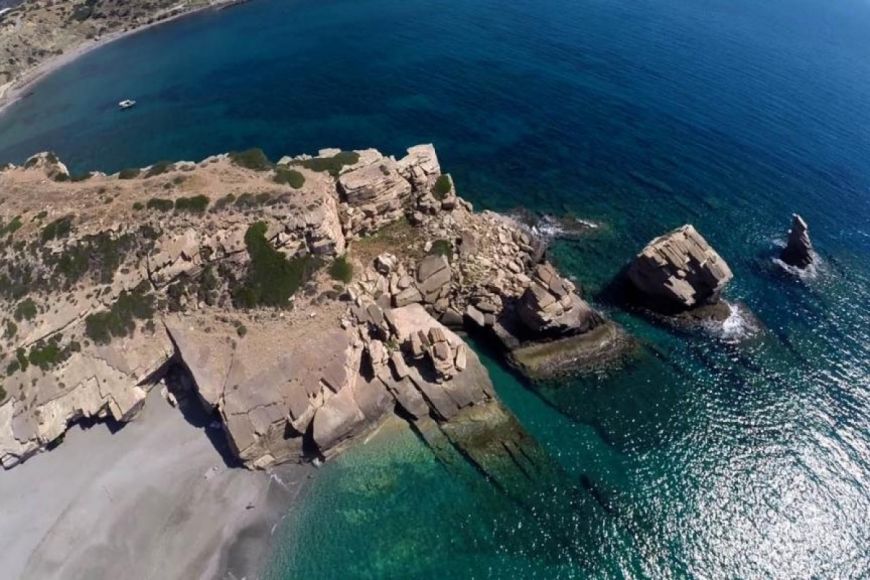 Ein schöner Strand mit Kieselsteinen und mit einem kleinen natürlichen Hafen auf der östlichen Seite. Westlich vom Strand befinden sich die 3 Felsen, nach denen der Strand benannt ist. Der Strand verfügt über Sonnenschirme und Liegestühle und eine kleine Taverne.